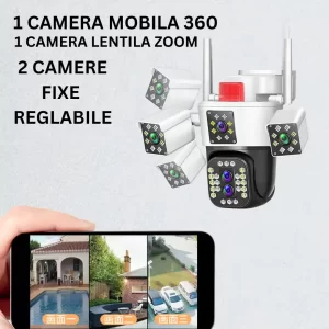 Cameră de supraveghere Wi-Fi 6K UltraHD cu 4 lentile, zoom optic 10X, vizualizare 360°, detecție mișcare, audio bidirecțional și control prin aplicație
