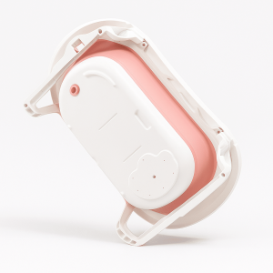 Cădiță bebeluși pliabilă roz cu termometru digital, pernuță moale, dop de scurgere și picioare anti-alunecare. Design ergonomic și materiale non-toxice, sigure și confortabile.