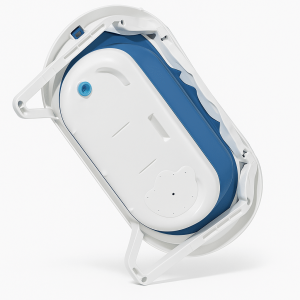 Cădiță bebeluși pliabilă albastră cu termometru digital, pernuță moale, dop de scurgere și picioare anti-alunecare. Design ergonomic, sigur și ușor de depozitat.
