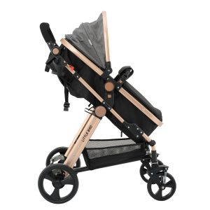 Cărucior Litle Bird maro-bej cu suspensii duble, pliere rapidă, spătar reglabil și design elegant. Confort maxim pentru copil, ușor de manevrat și transportat.