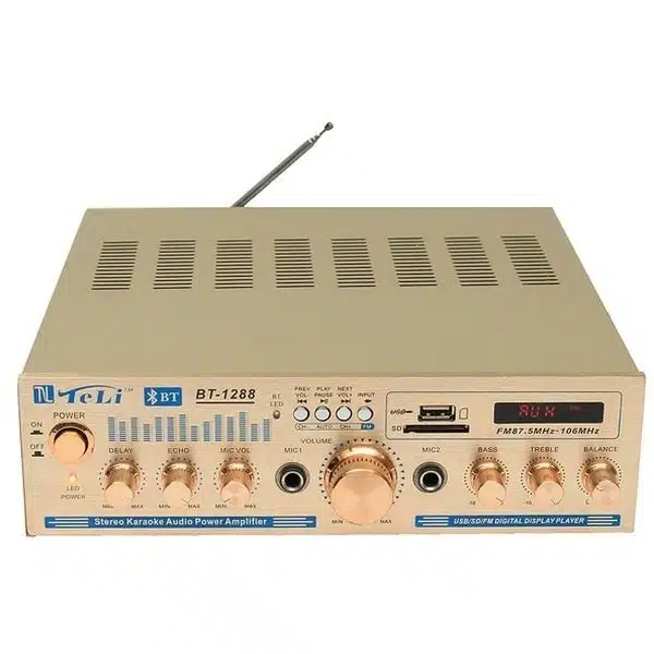 Amplificatorul audio BT1288 este centru tău de sunet complet, perfect pentru sistem audio acasă, karaoke, evenimente mici și petreceri. Cu conectivitate Bluetooth, citire directă de pe USB și card SD, intrări pentru 2 microfoane și control complet al volumului și efectelor, acest amplificator oferă o experiență audio versatilă și de calitate.