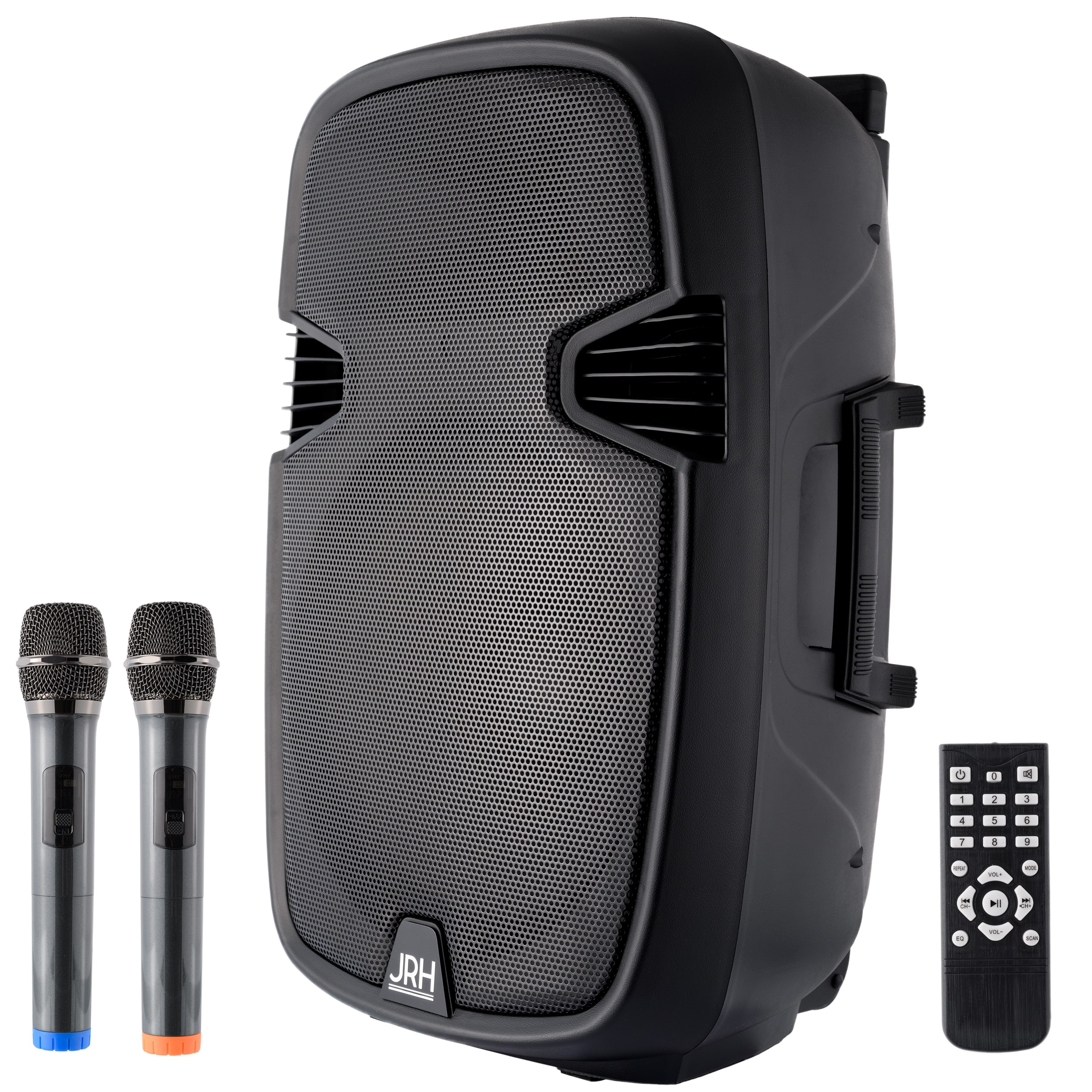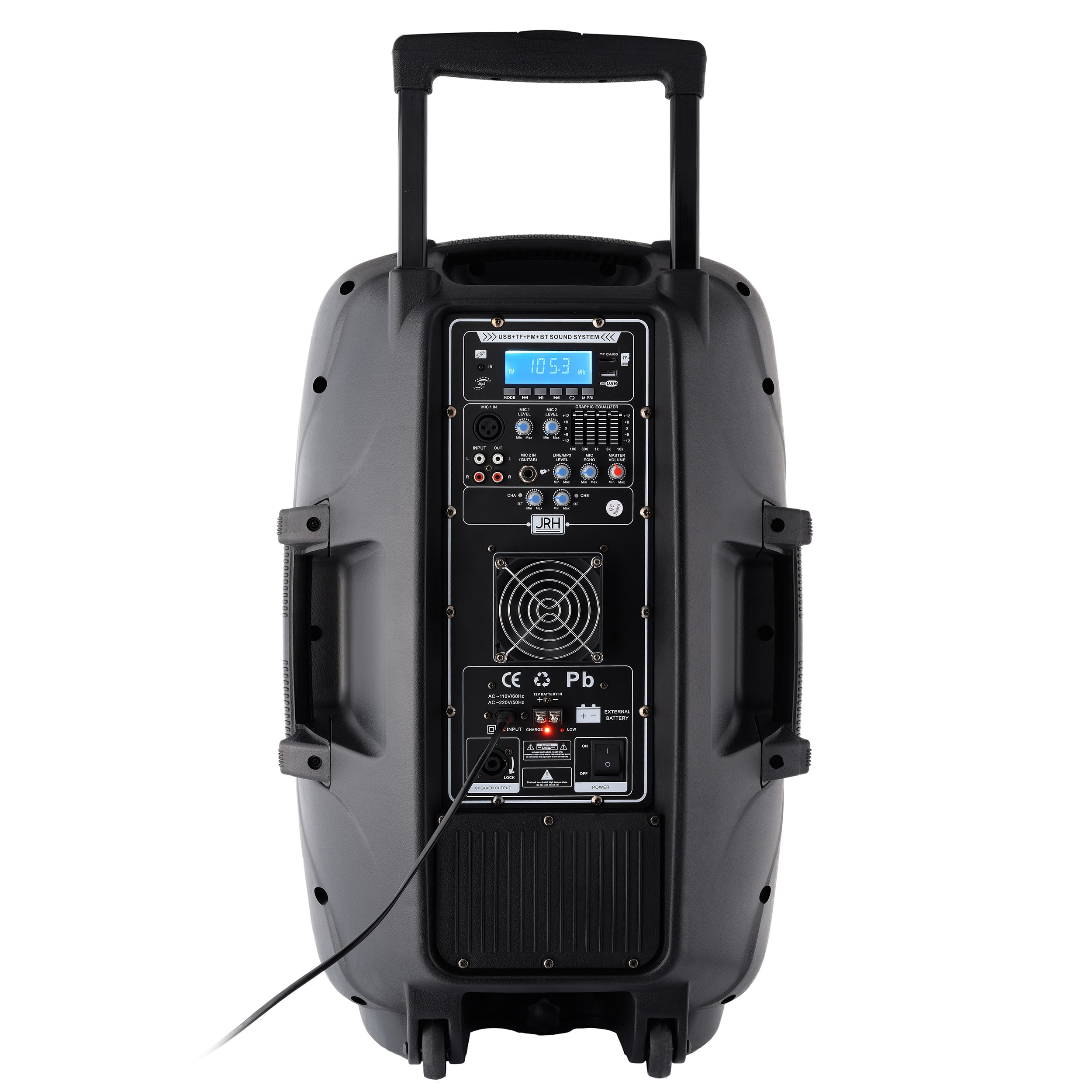Boxă portabilă JRH 15″ 1000W – Bluetooth, 2 microfoane wireless, USB/SD/FM, design tip troler cu roți și mâner retractabil