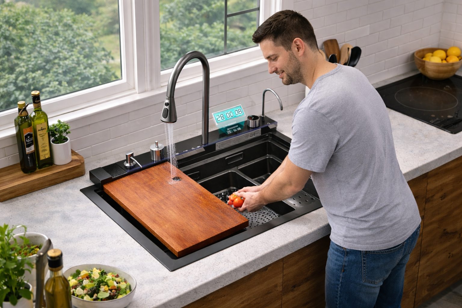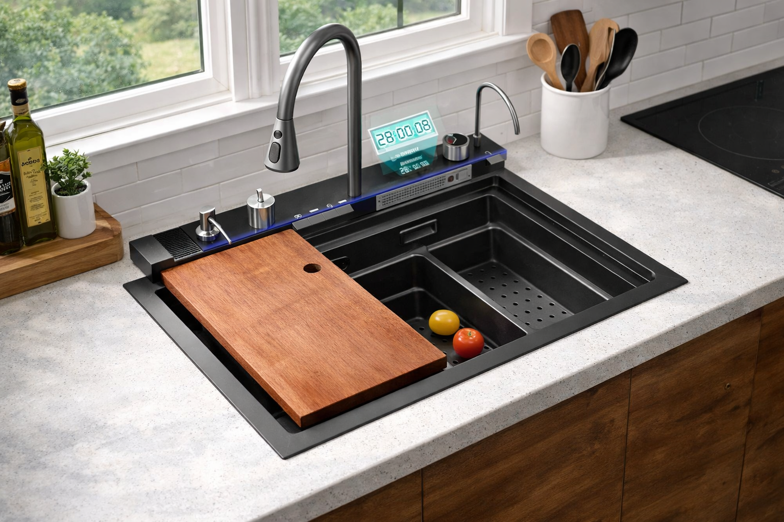 Chiuvetă Bucătărie Premium 75x45cm – Inox, Afișaj Digital, Robinet Cascadă & Accesorii Multifuncționale