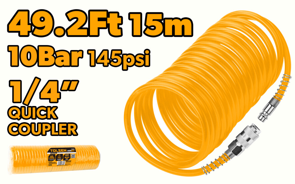 Furtun Aer Comprimat Tolsen AirXT 15m – 20 Bar, PVC Flexibil, Cuplaje Rapide Metalice, Ideal pentru Compresor și Scule Pneumatice