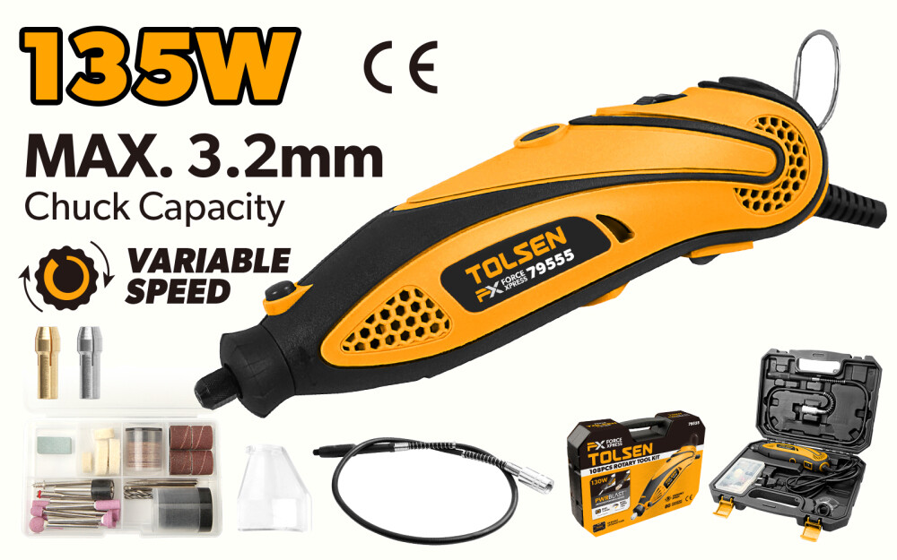 Mini polizor drept cu set 108 accesorii – 135W, 10.000–32.000 RPM, Tolsen FX Force Xpress 79555 – pentru șlefuire, tăiere și gravare