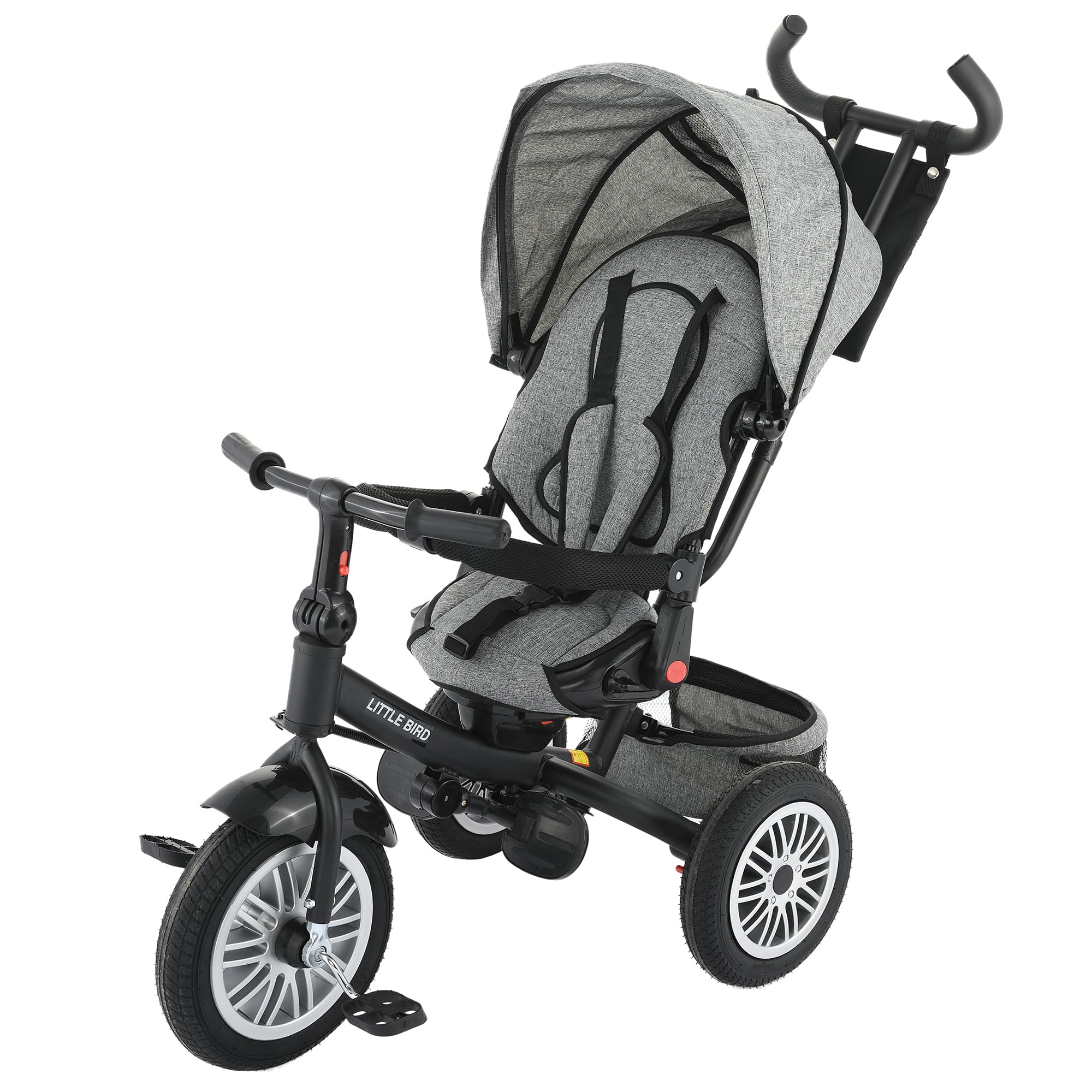 Ricicletă 4 în 1 Little Bird gri cu scaun rotativ 360°, poziție de somn, roți EVA și centură de siguranță. Transformabilă, sigură și confortabilă pentru copii 1–5 ani.