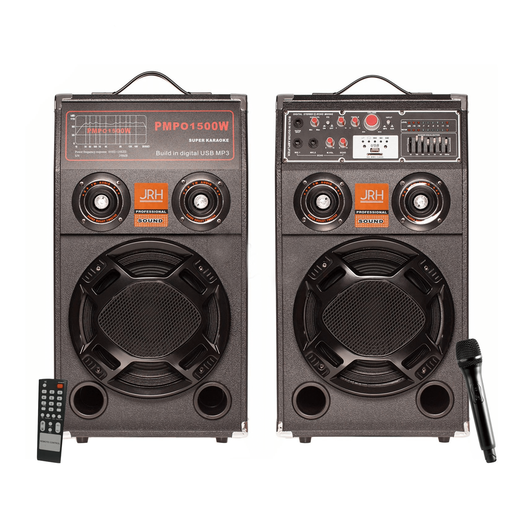 Set boxe active Bluetooth PRO 600W cu mixer EQ 7, telecomandă, port USB/SD și efect ECHO. Sunet clar, puternic și transport gratuit – ideal pentru karaoke și petreceri.