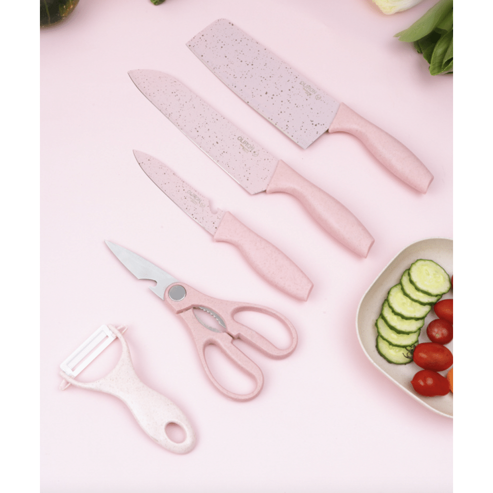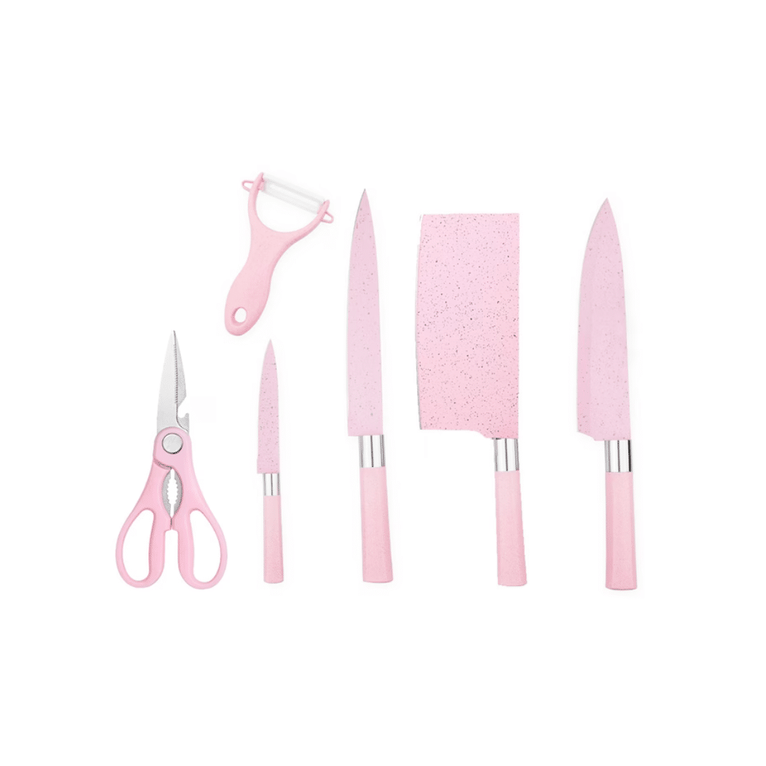 Set cuțite bucătărie 6 piese – Chef, pâine, satâr, decojit, foarfecă și suport – oțel 3Cr13, strat antiaderent, design roz premium