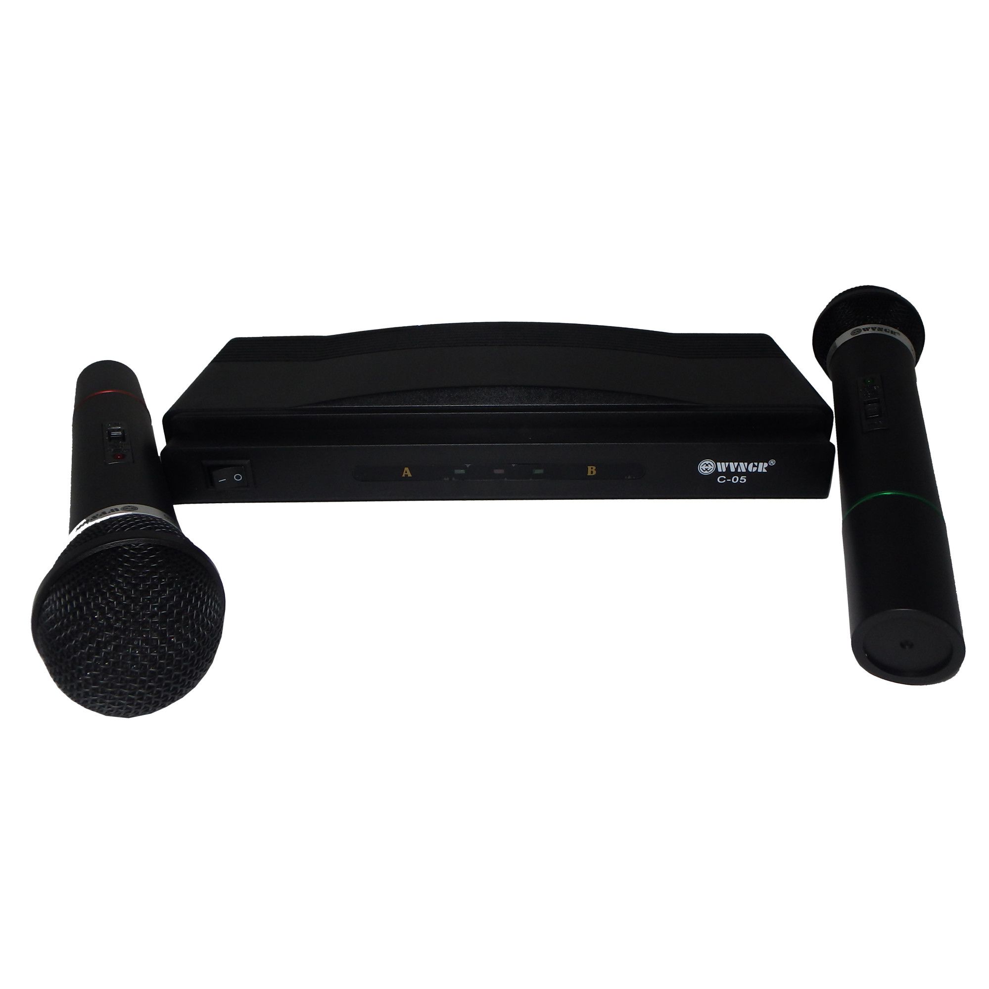 Set profesional 2 microfoane wireless WVNGR, cu semnal stabil până la 50 m, sunet clar, autonomie 8 ore și design elegant. Ideal pentru karaoke, evenimente și biserici.